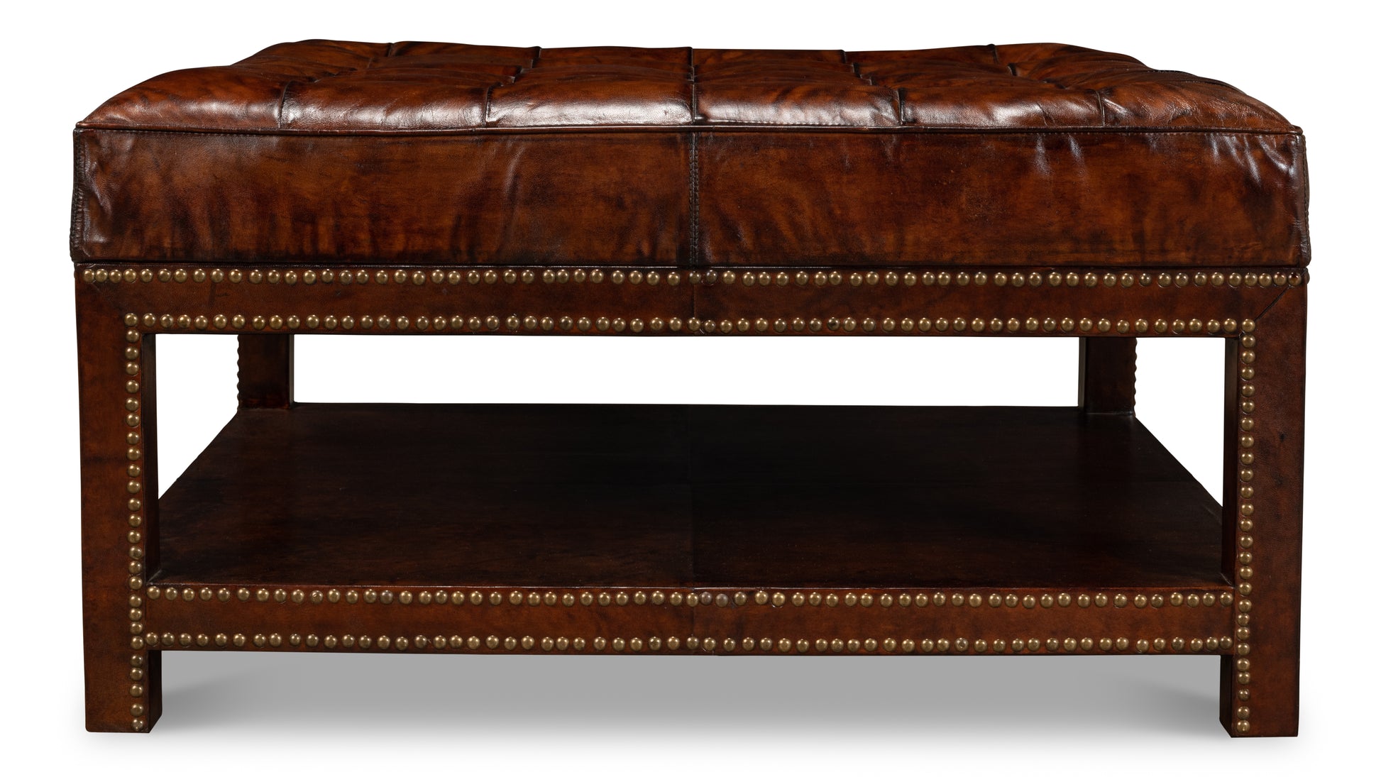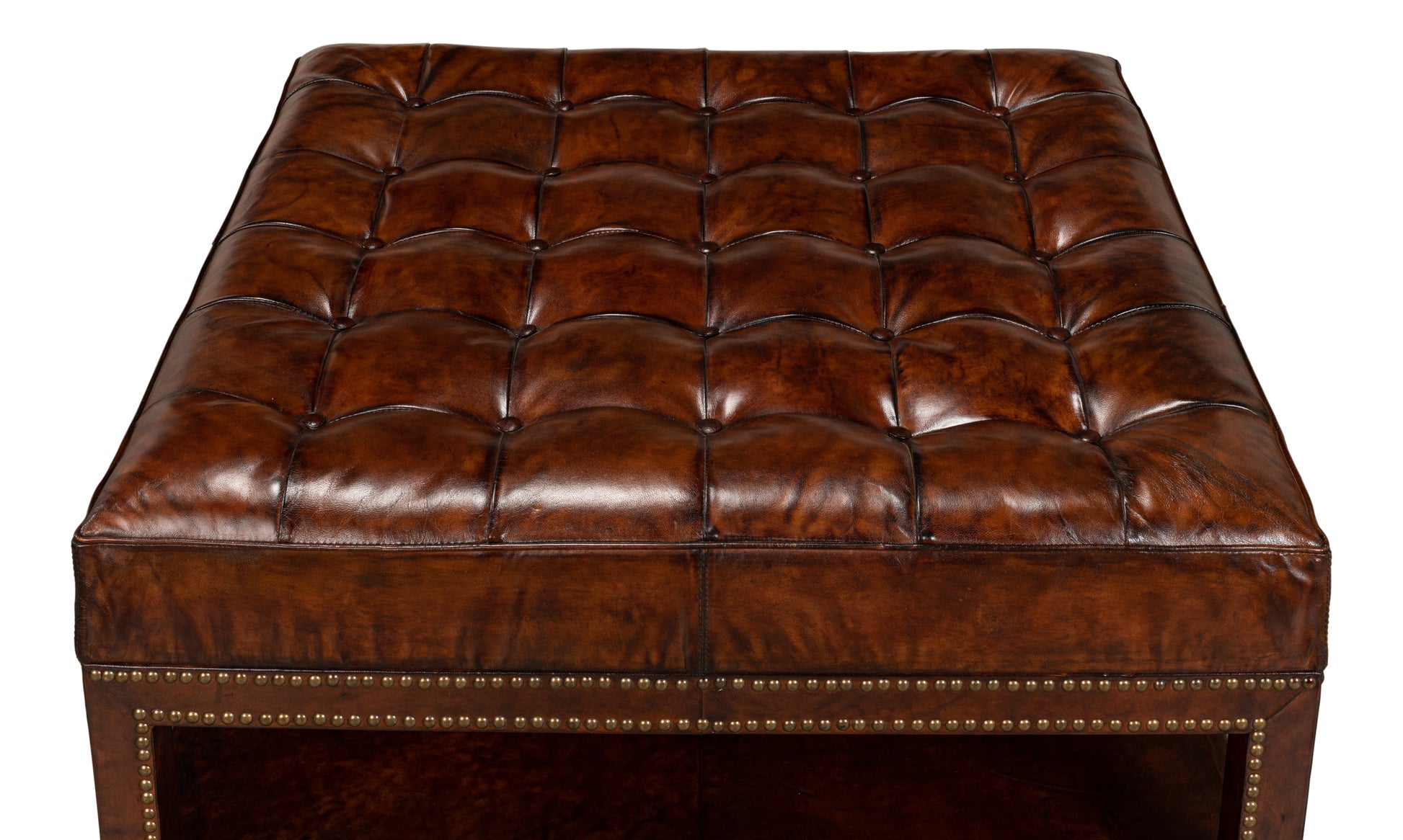 The solid hardwood frame is completely covered in Old Brown leather fixed with upholstery tacks. The cushioned top is fixed to the base with a tufted buttoned Chesterfield pattern.