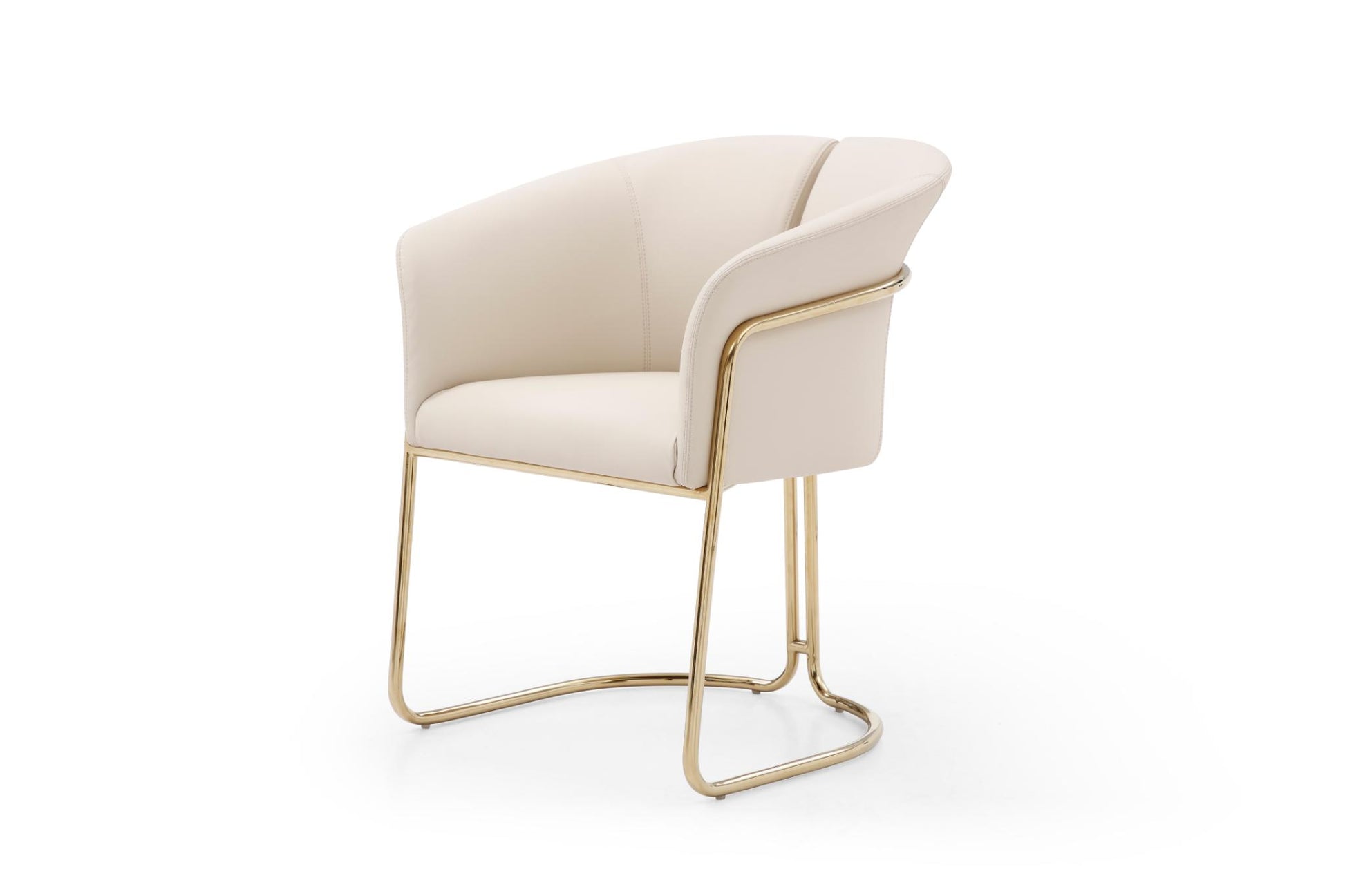 The Jolie dining armchair combines the comfort of a lounge chair with the functionality of a dining seat. Upholstered in premium beige eco-leather, it features a wrap-around backrest and integrated arms for maximum support.