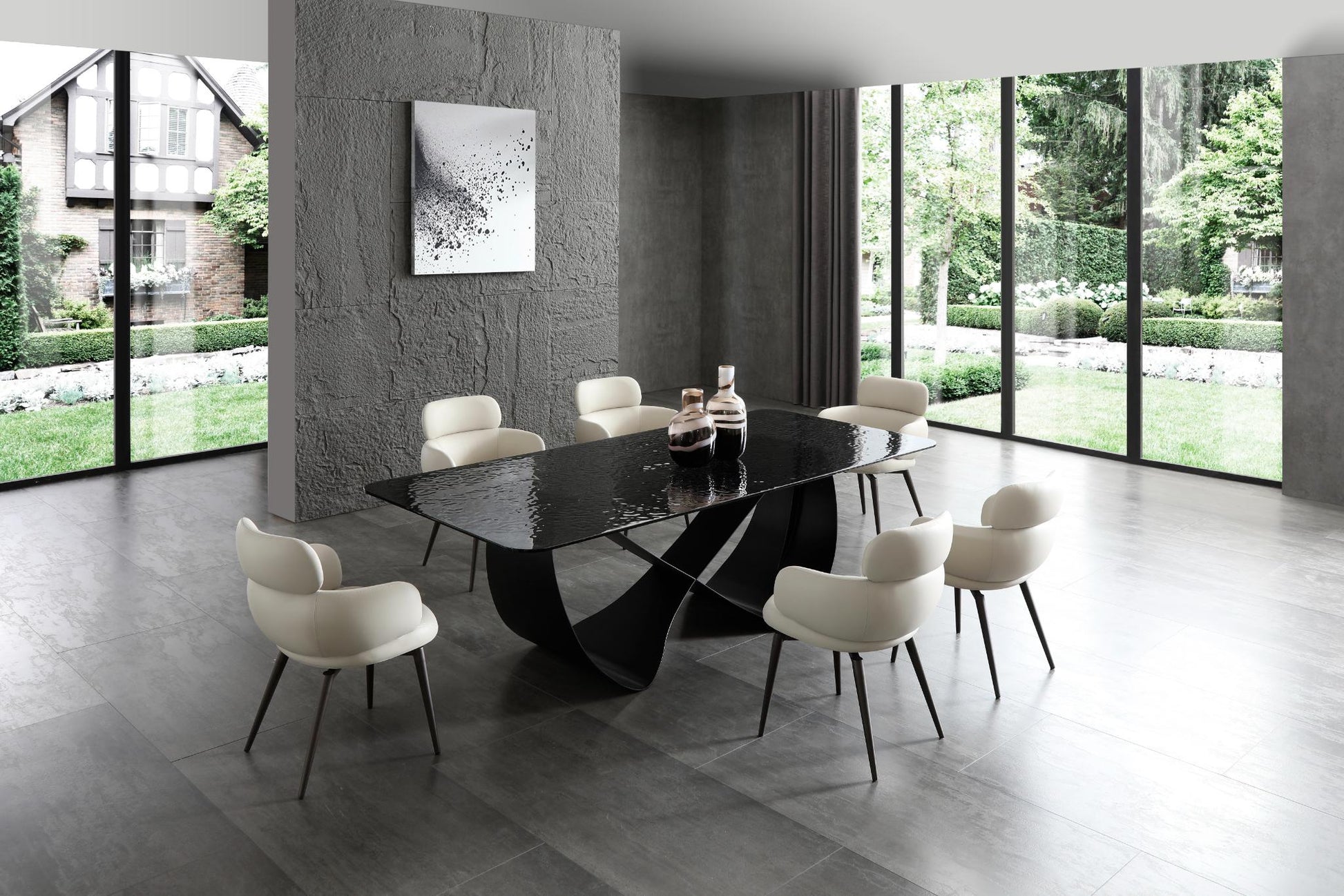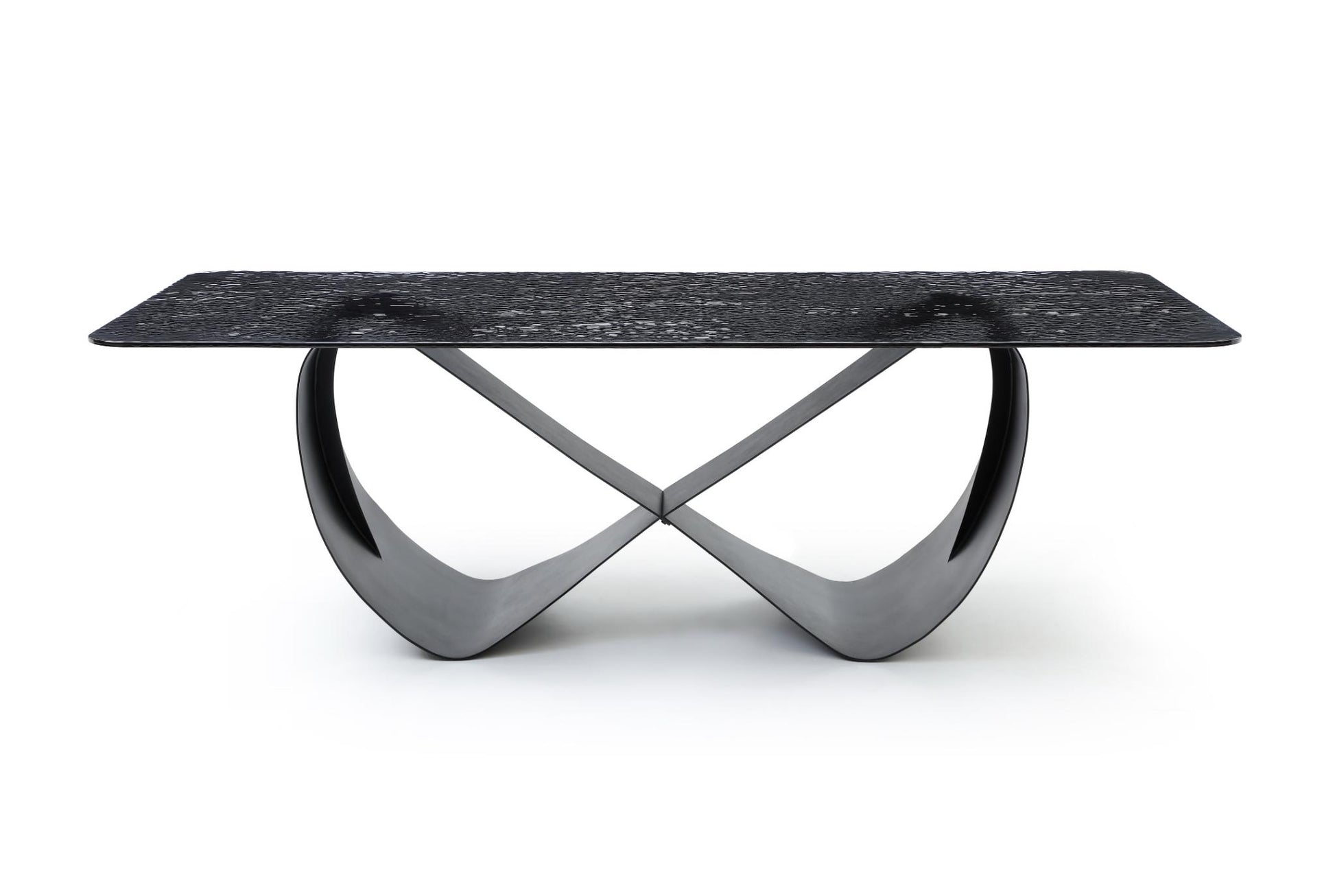 As a figurative artistic piece, the Tiffany Dining Table redefines the focal point of the modern home. The defining feature is the baseâ€â€a series of curved, sinuous legs and an intricate crosspiece that creates a sense of movement and grace. This black-on-black edition features a 12mm melted black glass top that provides a deep, reflective surface where "Life Happens Here" in style.