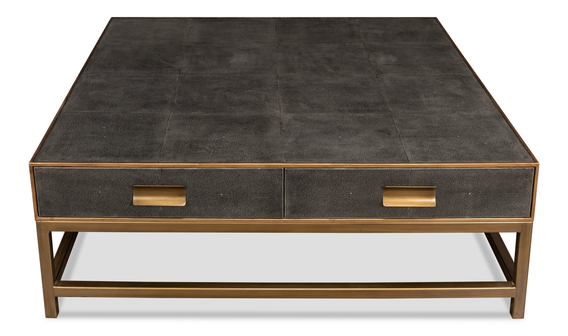 Unveil contemporary love with the Gideon Shagreen Square Coffee Table in Antique Grey. Crafted in wood, adorned with gold leather trim, and brass knobs, it"s where romance meets modern sophistication.