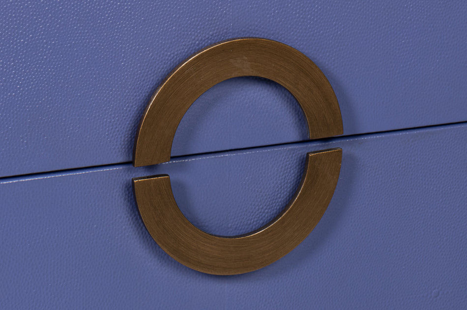Elevate your bedroom with Gabriella Night Stand in Marlin Blue. Enhanced by gold hardware and adorned with Embossed Shagreen leather in Marlin Blue hue, this 30"w x 18"d x 30"h piece epitomizes transitional elegance. The marriage of style and functionality creates a harmonious bedside companion, inviting you to embrace the subtle sophistication and timeless design of this exquisite nightstand.