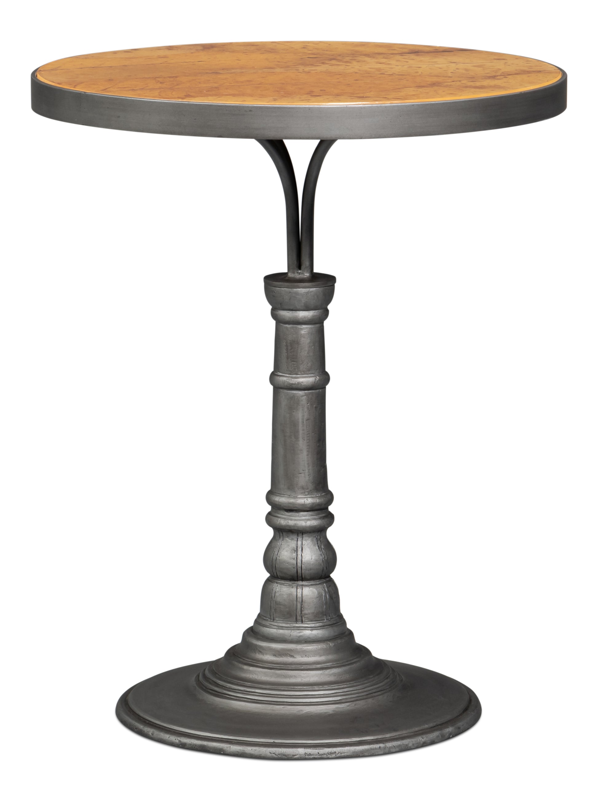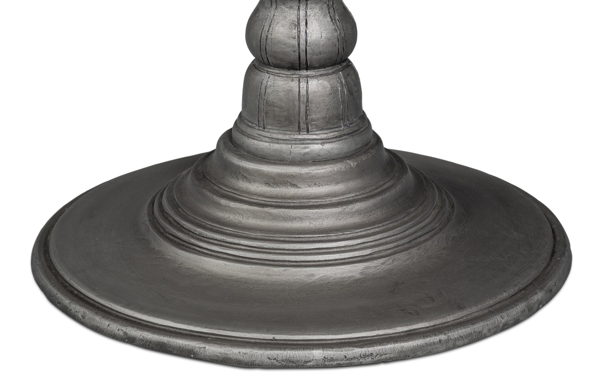 The Banner House Side table has a neo-classical design with industrial detailing and is crafted from cast aluminum in a gunmetal finish. The 25" high base supports a 20" diameter top. Both components are artisan crafted - the top from tobacco leaves by Artisan Leaf LLC in Wilson, N.C. This collaborative design honors the history of Sarreid Ltd and the local community.