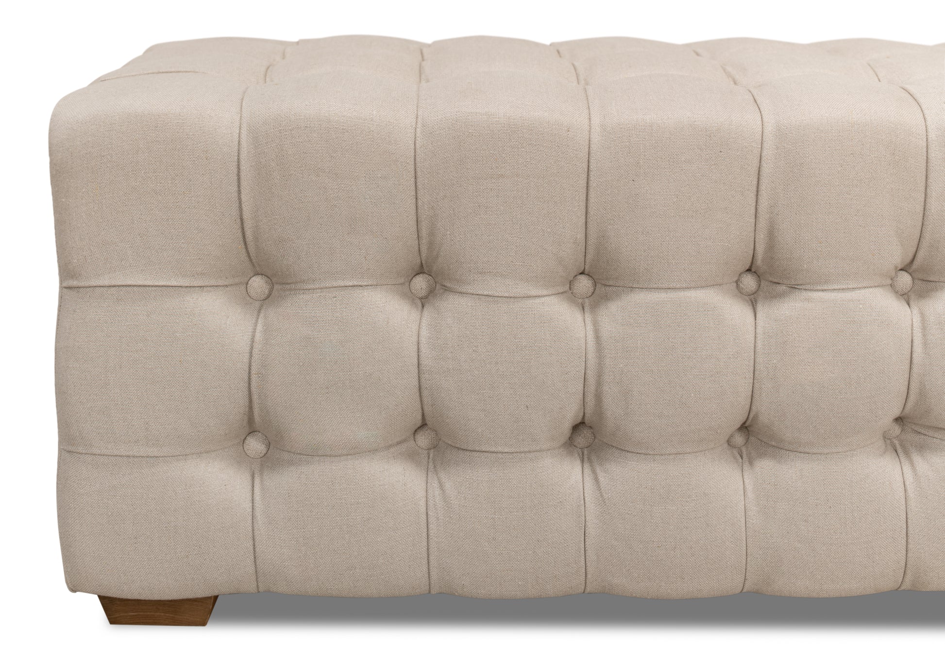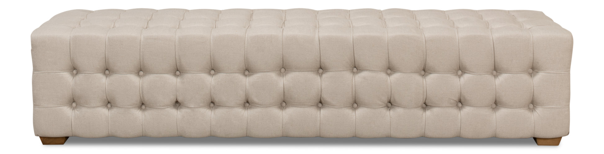 There's tufting all around on this long bench. The ring handles on either end add another very nice touch. It will be useful at a large dining table or in the foyer.