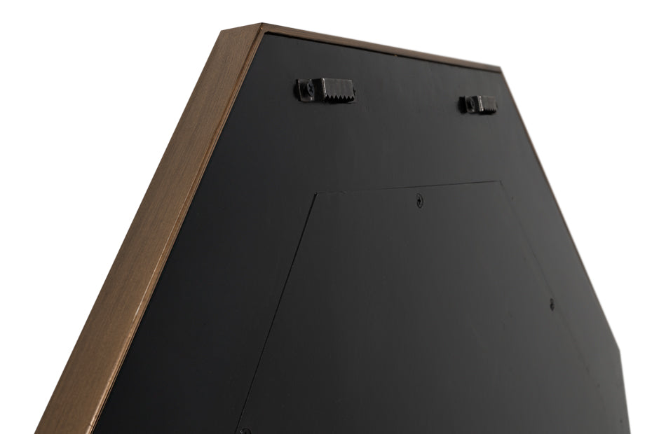 The octagonal frame of the watercress shagreeen leather adorned with handcrafted brass details surrounds a beveled mirror, elevating the design and complementing any room with its timeless elegance.