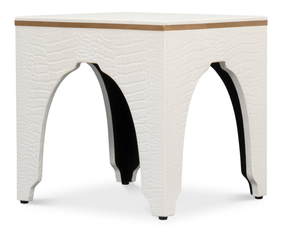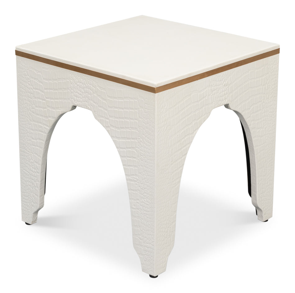 Elevate your space with the Croco Embossed Leather Stool in Antique Pearl. Luxuriously crafted with Antique Pearl Embossed Leather, this 18"w x 18"d x 19.5"h stool is a perfect blend of style and comfort. Relax in sophistication and enjoy the beauty of distinctive design.